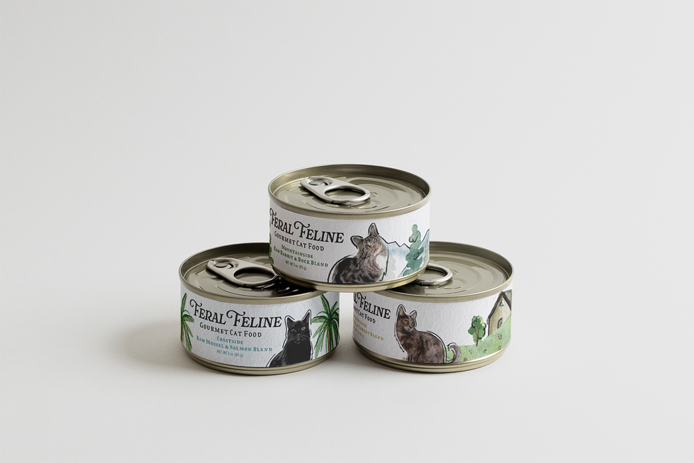 Feral Feline's name and design choices were inspired by the natural 'feral' instincts of cats when provided a quality diet and stimulating environment. It was important that the brand carried the feminine energy cats embody with an element of rawness to emphasize the natural ingredients within Feral Feline.